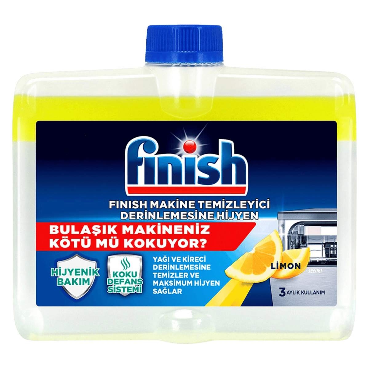 Bulaşık makinenizin; filtre, su gideri, pervane, su boruları gibi göze gözükmeyen yerlerinde oluşan kir birikintilerinden kaynaklı performans eksikliği olabiliyor. Bu tür durumlarda Finish Çift Etkili Temizleyici Limon ürünü kullanmak hem makinenizin gizli kısımlarını temizliyor hem de limon ferahlığı sağlıyor.