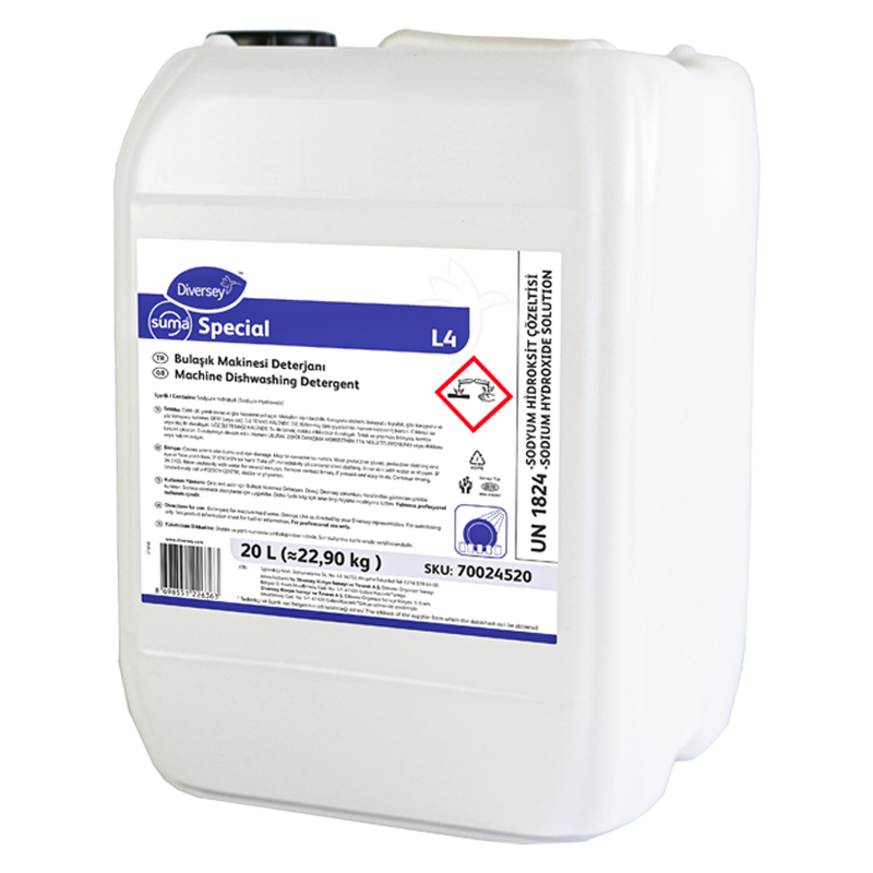 Suma Special L4 20L, en inatçı yağ ve kir tabakalarıyla dahi tavizsiz mücadele etmek üzere özel olarak formüle edilmiş, güçlü alkalinitesi sayesinde derinlemesine temizlik sağlayan, konsantre bir üründür. Bu üstün formül, mutfak gereçlerinizde, tabaklarınızda ve tüm yıkama makinelerinizde göz kamaştırıcı parlaklık ve hijyen garantisi sunar.